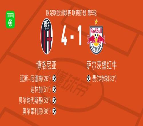 博洛尼亚41大胜萨尔茨堡红牛,奥尔索利尼、贝尔纳代斯基建功