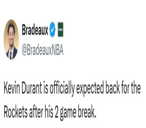 火箭记者Richardson此前表示:“运动员也是人。有时候,他们会遇到一些突发情况,这些情况必须优先于他们的运动。如果杜兰特无故缺席数周,我能理解大家向教练施压。但我们也要负责任地尊重他人的隐私。”